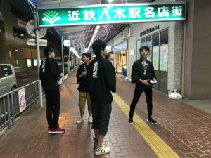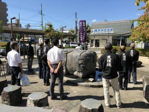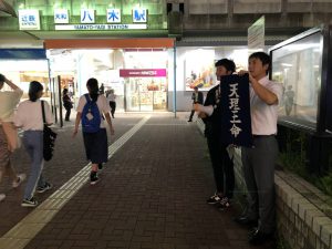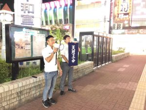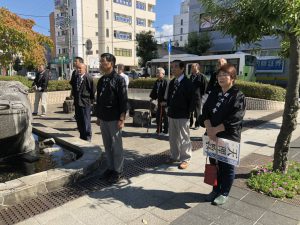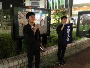 大教会が属する「橿原支部」は数カ所に分かれて実施。橿原神宮駅東出口前では、よろづよ八首奉唱の後、路傍講演とチラシ配りが行われた。