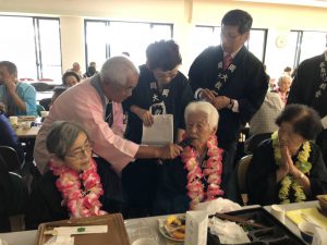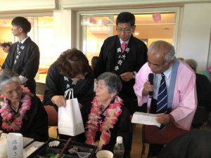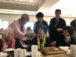 今年対象となった方は全員で235人。そのうち、34人が当日参拝下さり、お祝いの席を設けました。また、最高齢も100歳を超え、その一人の外薗君江さん(100歳/銀杏城分教会所属)は今も現役で、『天理時報』の手配りに歩いておられるそうです。